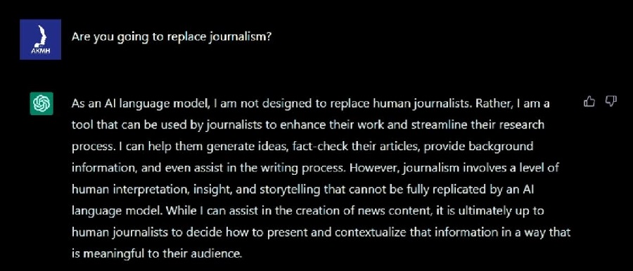 «Ώς ένα μοντέλο τεχνητής νοημοσύνης, δεν είμαι σχεδιασμένο ώστε να αντικαταστήσω ανθρώπους δημοσιογράφους. Στον αντίποδα, είμαι ένα εργαλείο που μπορεί να χρησιμοποιηθεί από ανθρώπους του χώρου ώστε να εμπλουτίσω την δουλεία και τον σχεδιασμό στην διαδικασία της έρευνας». Το ChatGPT συνέχισε την απάντηση του, λέγοντας: «Μπορώ να βοηθήσω στην δημιουργία ιδεών, στον έλεγχο των άρθρων, στην παροχή βασικών πληροφοριών και ακόμη να προσφέρω βοήθεια στην διαδικασία γραφής.