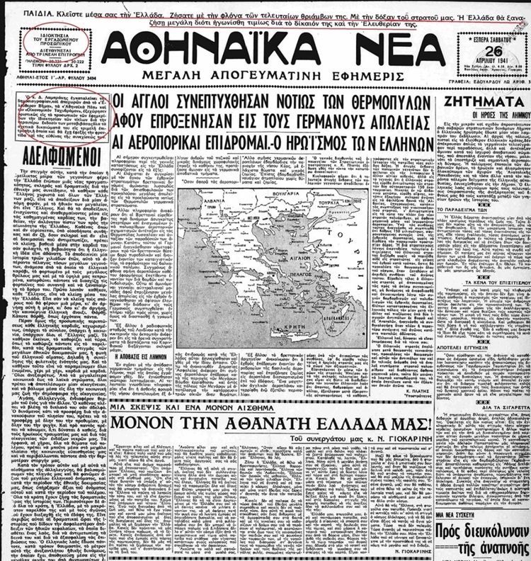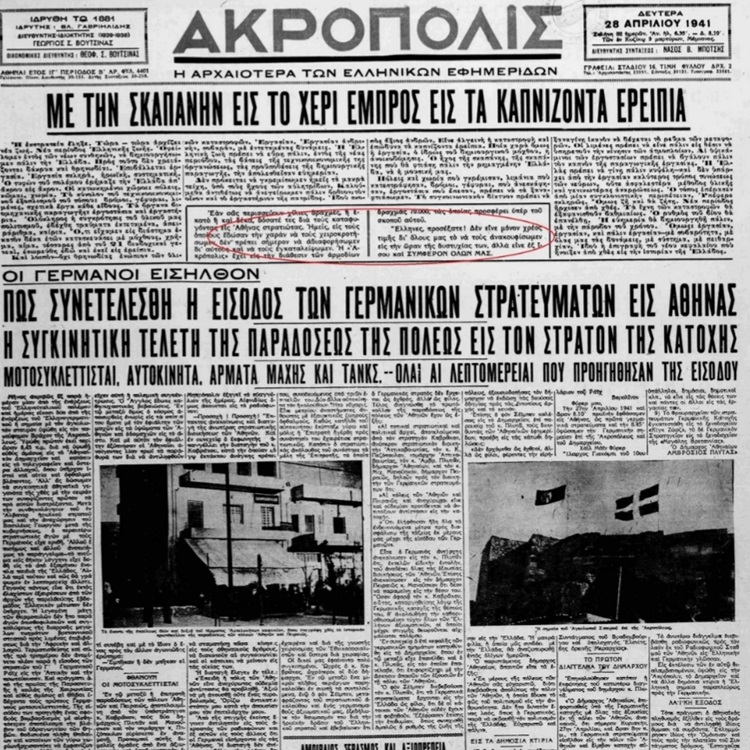 Στο ιδιο φύλλο όμως, ως πρωτοσέλιδο είχε την συγκινητική τελετή παράδοσης, όπως περιέγραψε την είσοδο των γερμανών, χωρίς όμως να κάνει λόγο για την ψυχρότητα των Ελλήνων πολιτών σε αυτη τη “Μεγάλη παρελαση” – κάτι που ήρθε αντίθετο με τα όσα είχαν συνηθίσει μέχρι τώρα οι κατακτητές. Οι κατακτητές είχαν καταλάβει τους χώρους εγκατάστασης εφημερίδων. Άλλες είχαν κλείσει τελείως και άλλες είχαν μείνει “ορφανες” από εκδότες. Ο Λαμπράκης, ο οποίος είχε τις εφημεριδες “Βήμα” και “Τα Νέα”, αποχώρησε από την δημοσιογραφία ενώ, ο Γιώργος Βλάχος έφυγε από την Καθημερινή της οποίας την τύχη σύντομα ανέλαβε ο Σπύρος Τραυλός. Ο συγκεκριμένος με το τέλος του πολέμου καταδικάστηκε ως δωσίλογος.