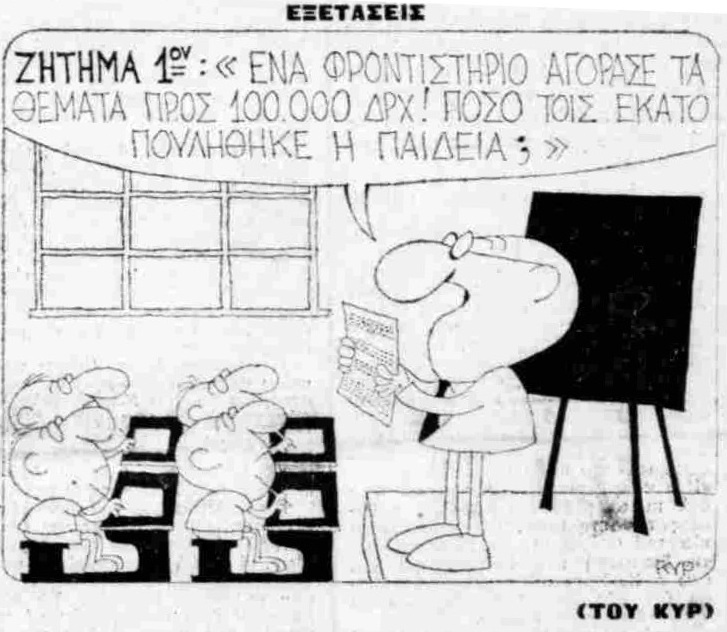 Ήταν Ιούνιος του 1979 και συγκεκριμένα παραμονές της εξέτασης των αρχαίων ελληνικών και των μαθηματικών, όταν στις αστυνομικές αρχές έφτασε η πληροφορία ότι κάποια φροντιστήρια μοίραζαν στους μαθητές τους τα θέματα που θα έπεφταν. Μέχρι οι αστυνομικοί να ελέγξουν την εγκυρότητα της φήμης, οι μαθητές εξετάστηκαν κανονικά. Λίγες ώρες αργότερα, οι αρχές προχώρησαν σε συλλήψεις καθώς διαπίστωσαν ότι πράγματι πριν από την εξέταση κάποια παιδιά έδειχναν σε φίλους τους τα θέματα, βέβαιοι ότι επρόκειτο για αυτά που θα έμπαιναν στις εξετάσεις.