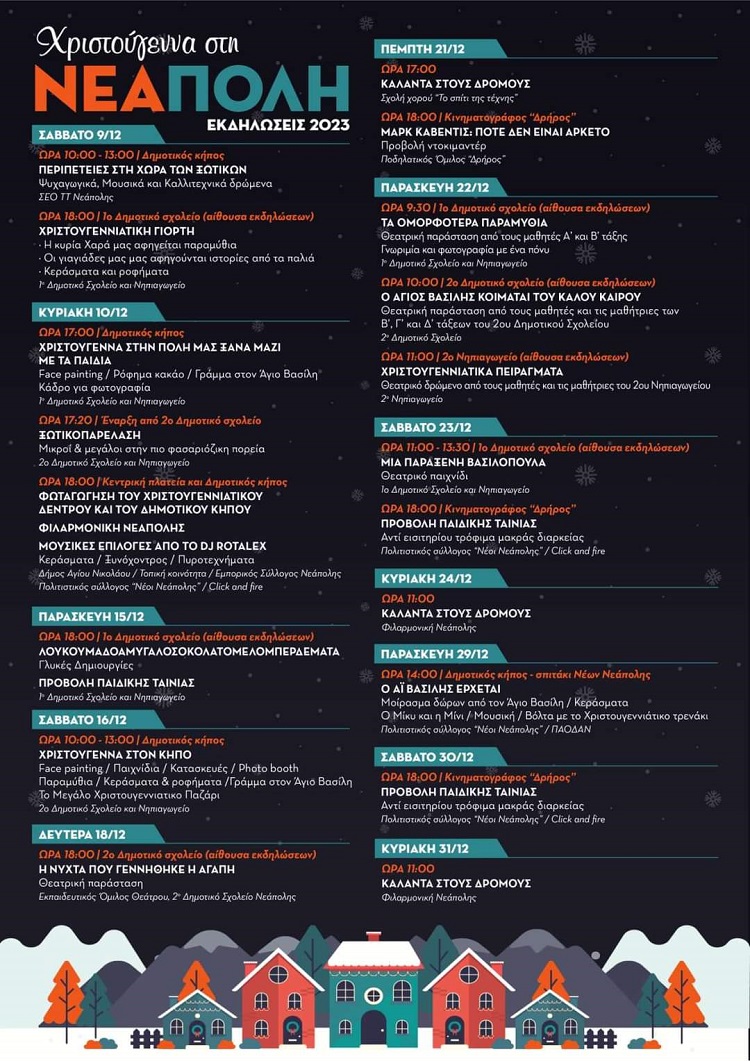 Χριστουγεννιάτικες γιορτές στα 2 δημοτικά σχολεία της πόλης, δράσεις στον δημοτικό κήπο, κινηματογραφικές προβολές στον κινηματογράφο Δρήρος, φωταγώγηση του δέντρου αλλά και κάλαντα τόσο από τη φιλαρμονική Νεάπολης όσο και από την σχολή χορού «Το σπίτι της τέχνης».